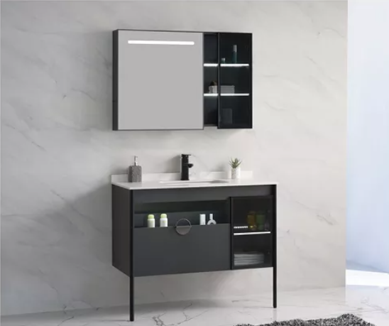 产品:浴室柜 颜色:铁灰 材质:多层实木免漆板 单位:套 尺寸:主柜:1005*480*840 镜柜:900*145*650 备注:不含龙头