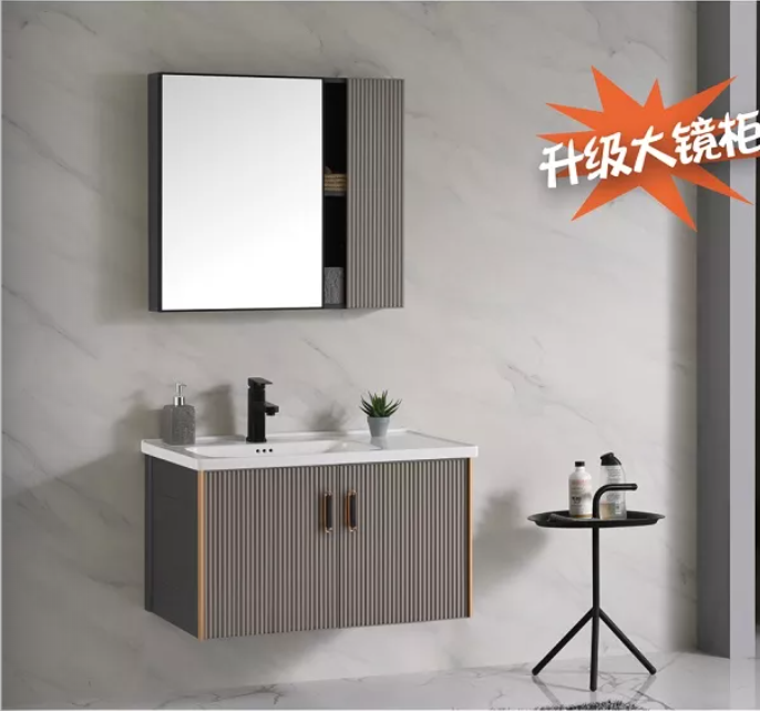 产品:浴室柜 材质:全铝 颜色:浅卡其 单位:套 尺寸:主柜:805*480*480 镜柜:780*120*650 备注:不含龙头