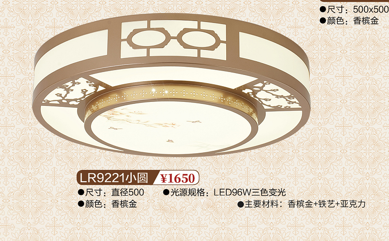 灯体尺寸:直径500 光源规格:LED96W三色变光 颜色:香槟金 主要材料:香槟金+铁艺+亚克力
