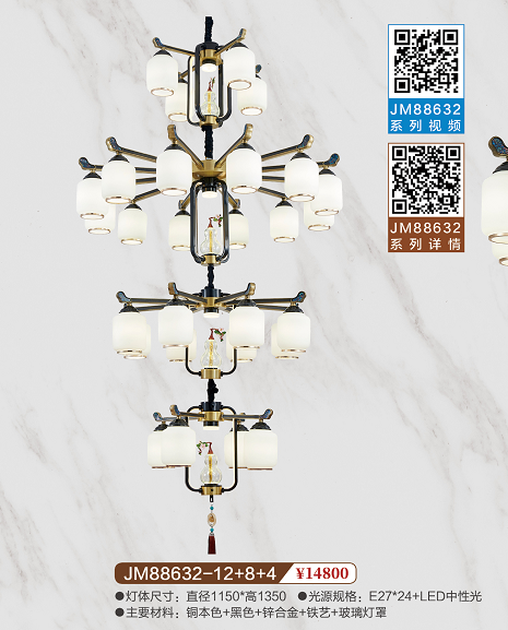 灯体尺寸:直径1150*高1350 光源规划:E27*24+LED中性光 材质:铜本色+黑色+锌合金+防尘罩+玻璃灯罩