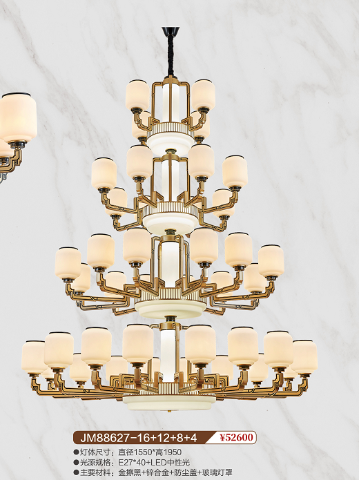 灯体尺寸:直径1550*高1950 光源规划:E27*40+LED中性光 材质:金擦黑+锌合金+防尘罩+玻璃灯罩