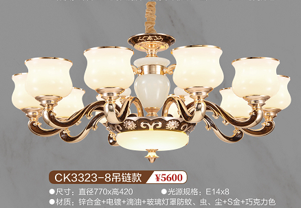 灯体尺寸:直径770*高420 光源规划:E14*8 材质:锌合金+电镀+滴油+玻璃灯罩防蚊、虫、尘+S金+巧克力色