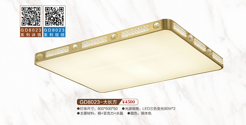灯体尺寸:直径800*600*50 光源规划:LED中性光90W*2 材质:铜+亚克力+水晶 颜色:铜本色