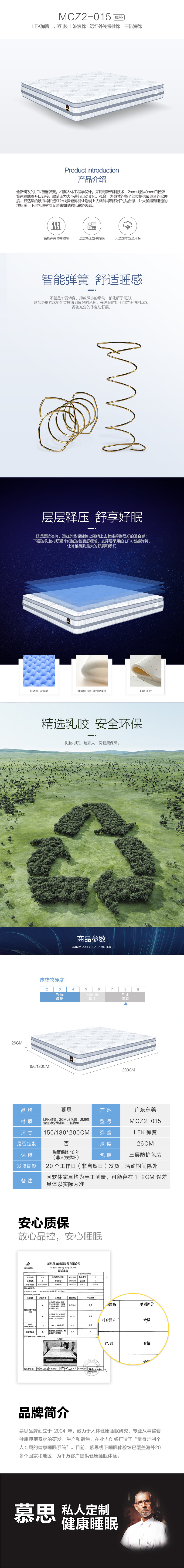 床垫内部支撑层采用 LFK 弹簧,独特开口设计能根据压力的增加进行智能贴合和支撑,完美适应各种体型和睡姿的变化,匹配不同体型与身体部位,让你感受到柔软的包裹性,更快进入深睡眠。多重释压床垫舒适层含有乳胶,乳胶被称为大自然的空调,天然蜂窝状小孔能保持床垫内部的干爽度,而且乳胶可以增加床垫的舒适度,乳胶的回弹性与贴合性也是非常好的,而且配合波浪棉的舒缓性,它能够放松肌肉,睡眠温度触感更舒适。双重防螨床垫舒缓层加入乳胶,乳胶自带无数透气孔,可以排出睡眠过程中人体多余热气和湿气,能够全方位的预防螨虫滋生,在配合独有的三防海绵材质设计,兼具抑菌防螨和安神助眠效果。