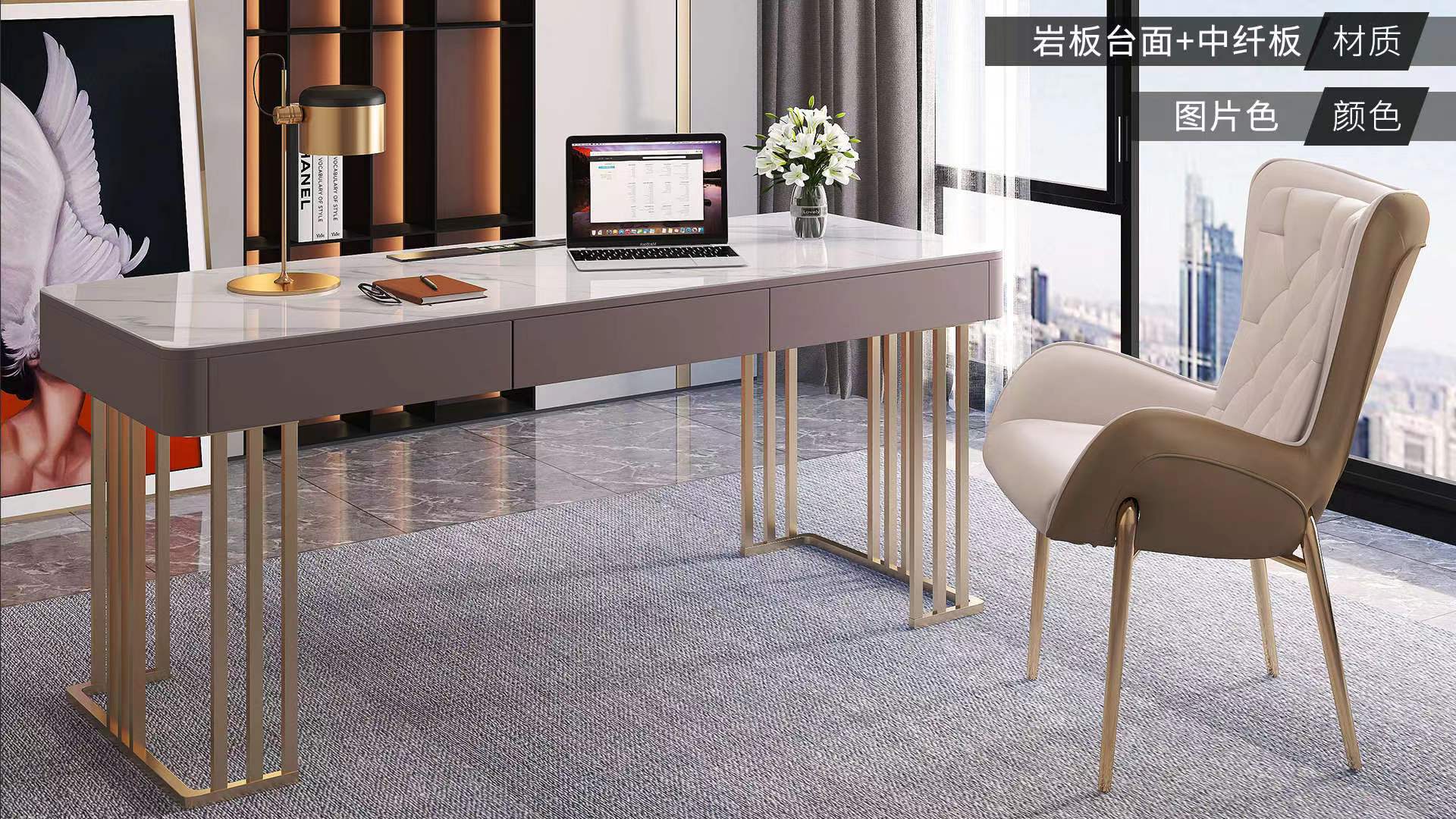 规格:桌子:长140*宽70*高76cm、长160*宽70*高76cm、长180*宽70*高76cm 颜色:颜色:雪山白岩板+棕色烤漆+中纤板+金色不锈钢+线槽插座 材质:进口亮光岩板+环保中纤板+烤漆+线槽插座+钛金不锈钢 风格:意式极简 持点:坚硬耐高温岩板搭配轻奢钛金钢架,时尚美观奢华亮丽稳固性,经久耐用。 色差问题是无法避免的,因为拍摄光线和每个人手机电脑显示器屏幕不同,会造成色差,购买前请知悉