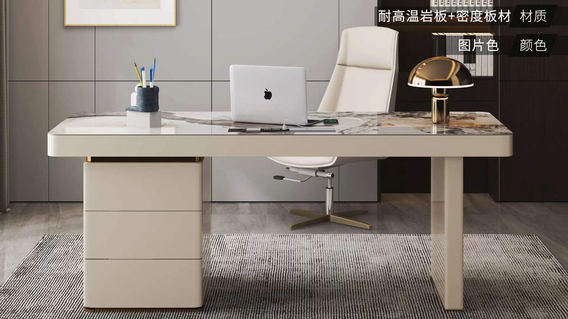 型号: SZ006 规范:书桌:长120*宽70*高75CM、长140*宽70*高75CM、长160*宽70*高75CM、长180*宽70*高75CM 椅子:宽52*深50*高118CM 颜色:象牙白偏光烤漆+岩板+密度板材+钛金拉手 材质:环保密度板材+烤漆+耐高温岩板+钛金不锈钢 风格:意式轻奢 特点:坚硬耐高温岩板搭复古轻奢配色时尚,加上钛金脚稳固性,经久耐用。