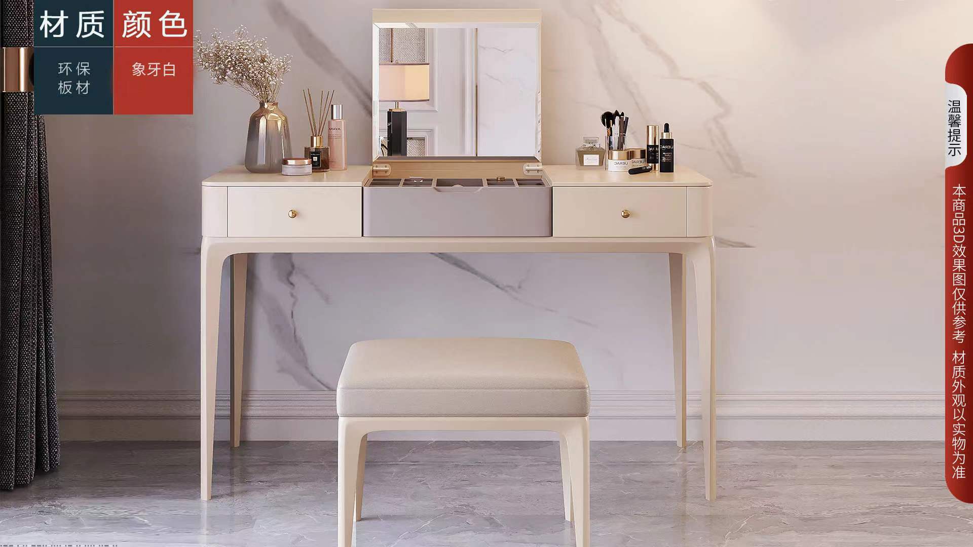 型号: 2917# 梳妆台尺寸: 1200*500*750MM 妆凳尺寸:长510*宽410*高420MM 圆妆凳尺寸:直径370*高420MM 颜色:象牙白 材质:镀金金属/环保水性烤漆面板