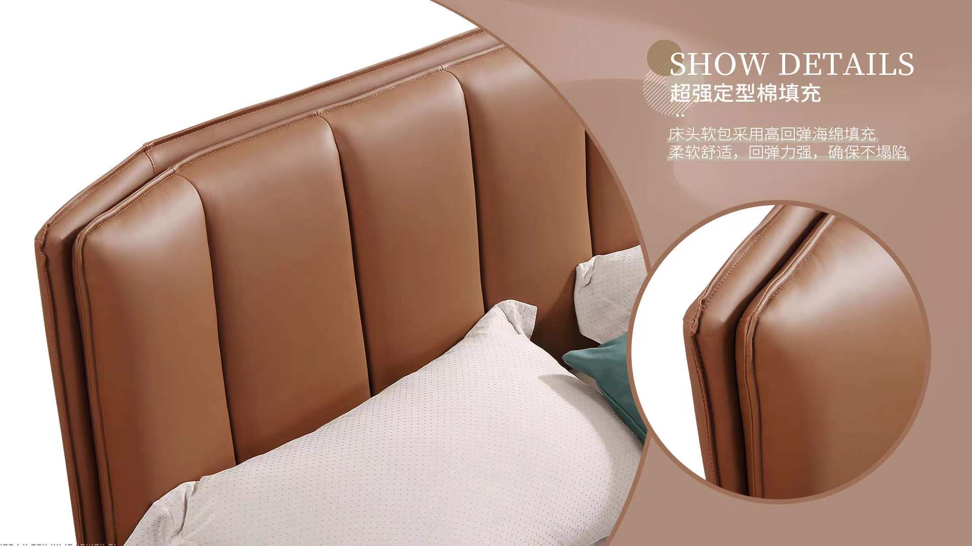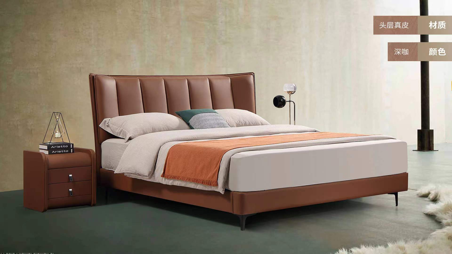 材质/头层真皮 颜色/深咖 规格/ 1.8米床内框尺寸:长2000* 宽1800mm 外框尺寸:长2220*宽1930高1050mm 床头柜尺寸:宽400深470*高490mm 特点/ 1.采用竖条靠包设计,整体流线舒适协调,深咖色的搭配沉稳且优雅。 2.使用进口落叶松钢木排骨架,承受重量高达700公斤以上。 3.使用实木抽床头柜,也可改色,详情请咨询厂家。 、