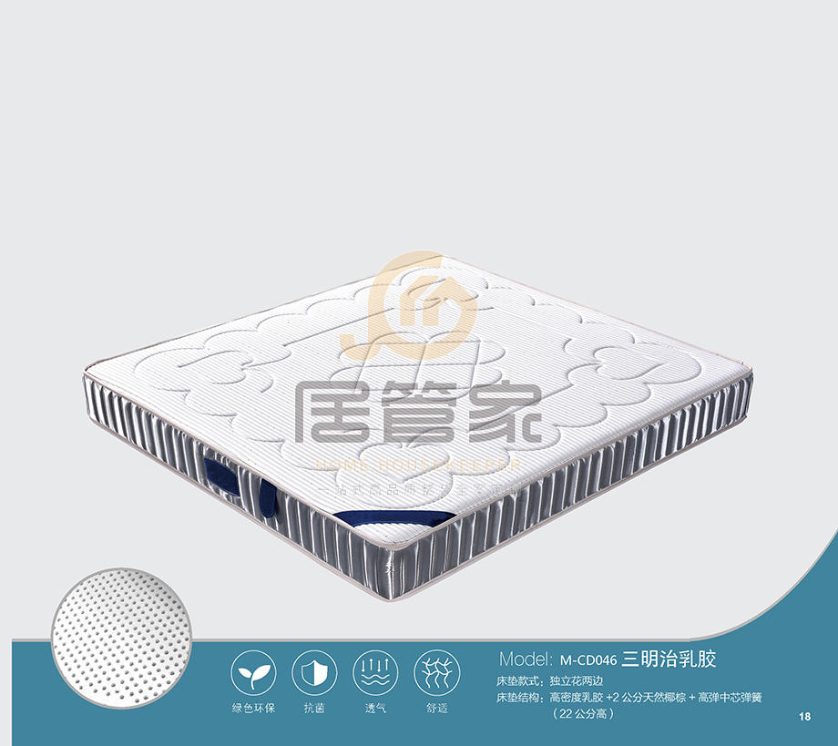 名称: 软床垫 单位风格: 独立花两边(三明治乳胶) 规格尺寸:mm 1.8米 材质: 高档乳胶独立花面料+2公分天然椰棕+200克pk棉+18排中芯弹簧200克pk棉+高档针织棉料(22公分高)