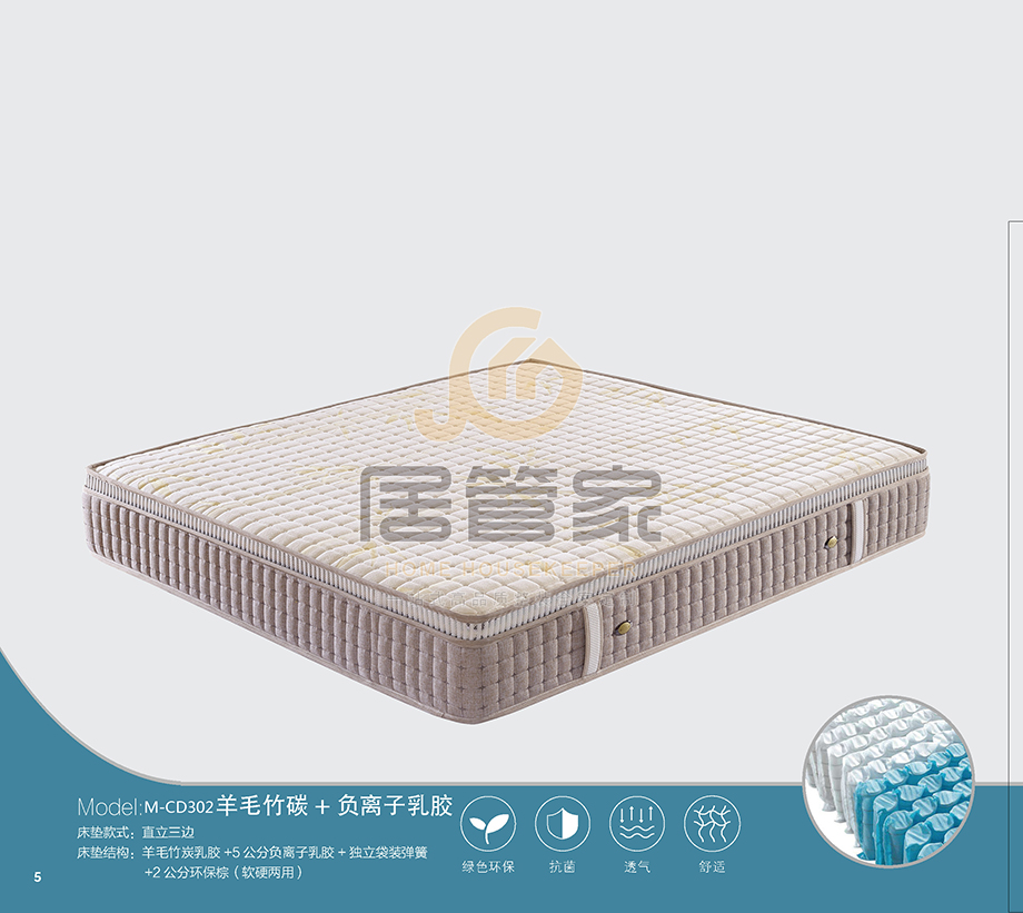 名称: 软床垫 单位风格: 羊毛竹炭 负离子 规格尺寸:mm 1.5米 材质: 羊毛竹炭乳胶面料+5公分负 离子乳胶+白色网布+环保硬 棉2张+9分区独立袋装弹簧 +2公分环保棕+pk棉+高档 针织棉料(软硬两用)