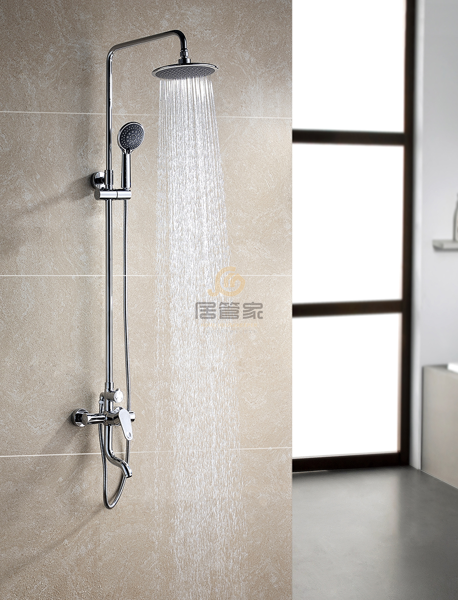 花洒 IHTJ-23A02 花洒参数配置: ① 重力铸造,使用国标59A级,环保铜材; ② 表面加厚镀层:8-12um; ③ 标配万海阀芯,铜压盖; ④ 23x19铜大淋浴管,壁厚1.0mm,全铜固定座; ⑤ 360°旋转双扣软管,外管304不锈钢,EPDM内管 ⑥ 全铜顶喷、手持。
