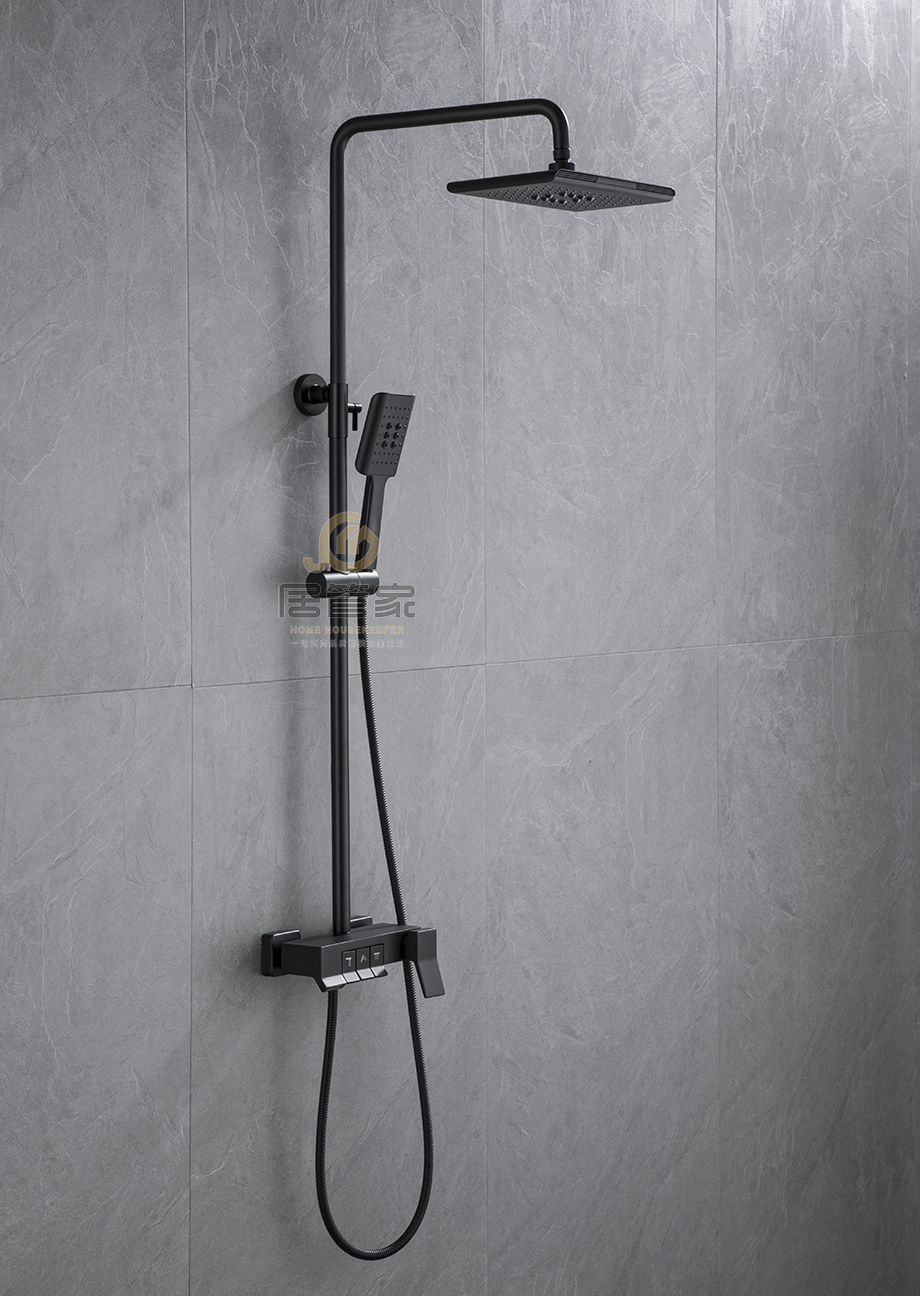 花洒 IHTJ-按键黑色圆管 花洒参数配置: ① 重力铸造,使用国标59A级,环保铜材; ② 表面加厚镀层:8-12um; ③ 标配万海阀芯,铜压盖; ④ 23x19铜大淋浴管,壁厚1.0mm,全铜固定座; ⑤ 360°旋转双扣软管,外管304不锈钢,EPDM内管 ⑥ 全铜顶喷、手持。