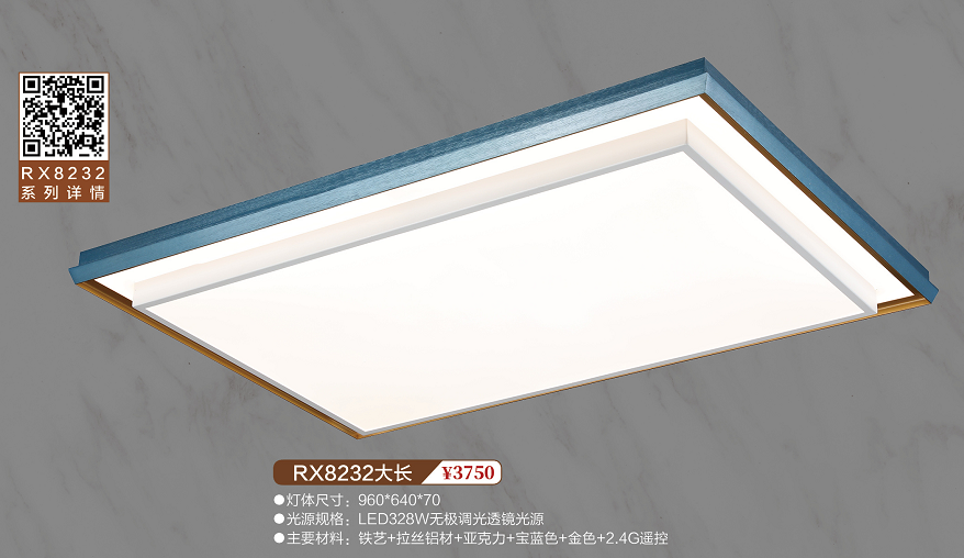 灯体尺寸:960*640*70 光源规格:LED328W无极调光透镜光源 主要材料:铁艺+拉丝铝材+亚克力+宝蓝色+金色+2.4G遥控