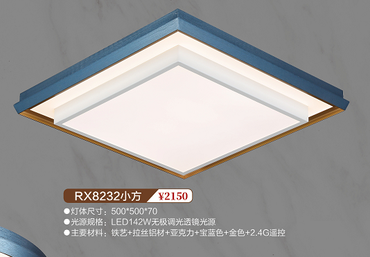 灯体尺寸:500*500*70 光源规格:LED142W无极调光透镜光源 主要材料:铁艺+拉丝铝材+亚克力+宝蓝色+金色+2.4G遥控