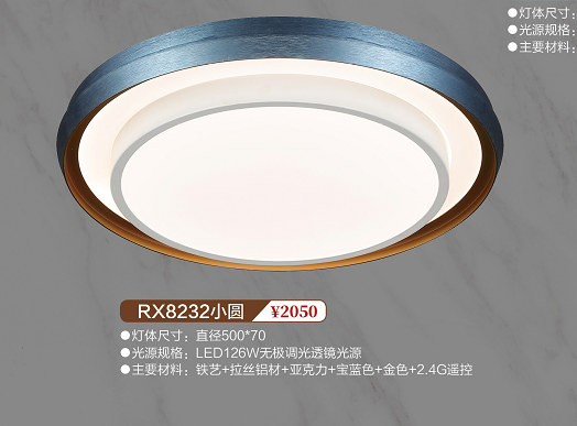 灯体尺寸:直径500*70 光源规格:LED126W无极调光透镜光源 主要材料:铁艺+拉丝铝材+亚克力+宝蓝色+金色+2.4G遥控