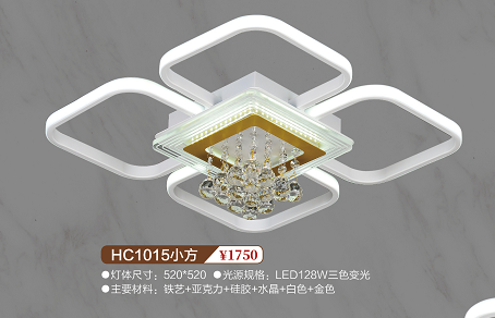 灯体尺寸:直径500 光源规格:LED110W三色变光 主要材料:铁艺+亚克力+硅胶+水晶+白色+金色