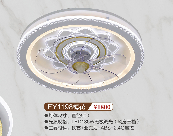 灯体尺寸:直径500 光源规格:LED136W无极调光(风扇三挡) 主要材料:铁艺+亚克力+ABS+2.4G遥控