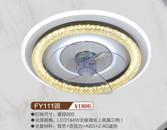 灯体尺寸:直径500 光源规格:LED136W无极调光(风扇三挡) 主要材料:铁艺+亚克力+ABS+2.4G遥控