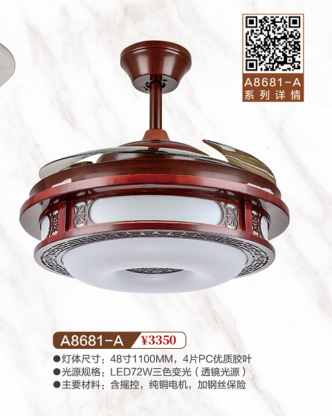 灯体尺寸:48寸1100MM,4叶专利款PC优质胶叶 光源规格:LED72W三色变光(透光光源) 主要材料:含遥控,纯铜电机,加钢丝保险,