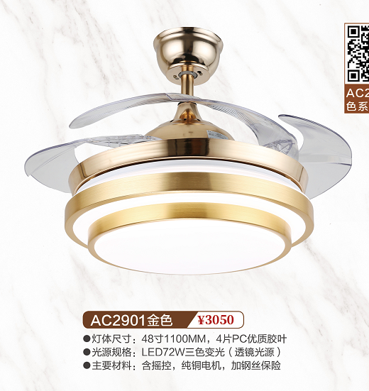 灯体尺寸:48寸1100MM,4叶专利款PC优质胶叶 光源规格:LED72W三色变光(透光光源) 主要材料:含遥控,纯铜电机,加钢丝保险,