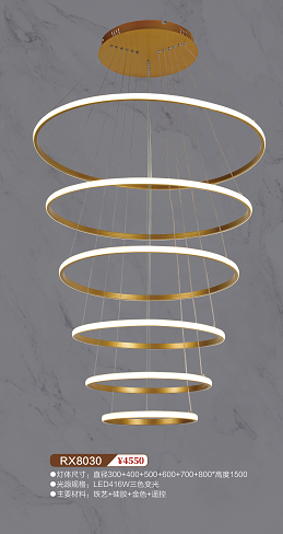 灯体尺寸:直径300+400+500+600+700+800*高度1500 光源规格:LED416W三色变光 主要材料:铁艺+硅胶+金色+遥控