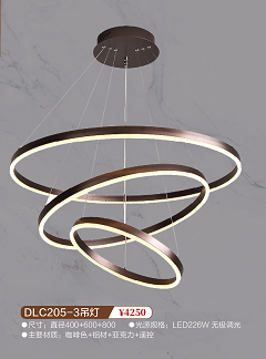 灯体尺寸:直径400+600+800 光源规格:LED226W无极调光 主要材料:咖啡色+铝材+亚克力+遥控