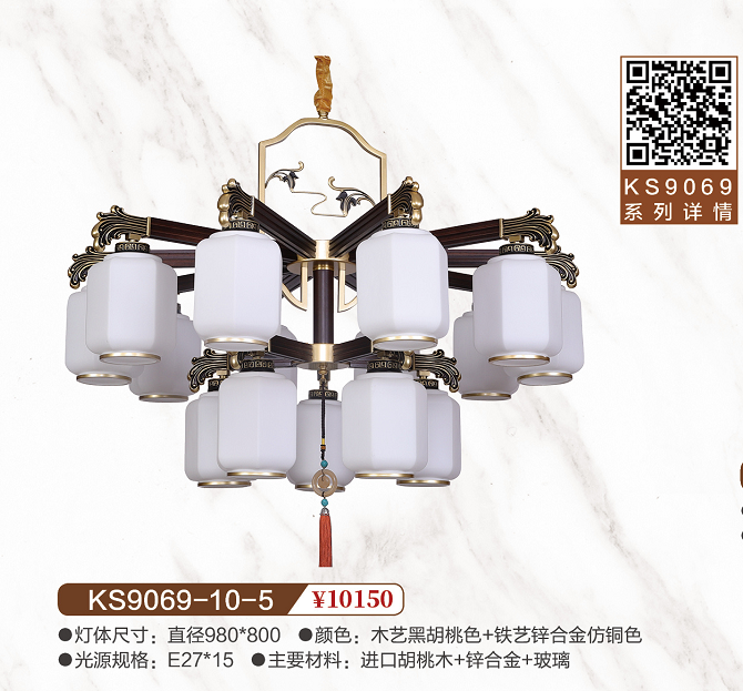 灯体尺寸:直径980*高800 光源规格:E27*15 颜色:木艺黑胡桃木+锌合金仿古铜色 主要材料:进口胡桃木+锌合金+玻璃