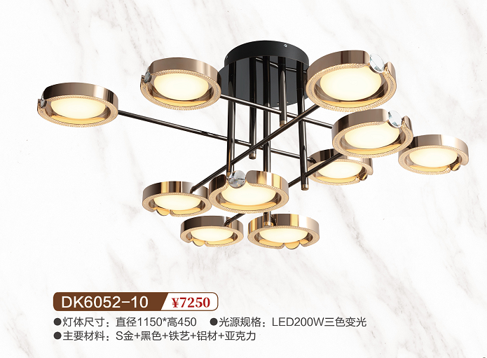 灯体尺寸:直径1150*高450 光源规格:LED200W三色变光 颜色:S金+黑色+铁艺+铝材+亚克力
