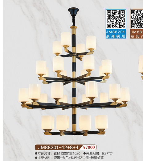 灯体尺寸:直径1300*高1020 光源规划:E27*24 材质:黑色+金色+铁艺++防尘罩+玻璃灯罩