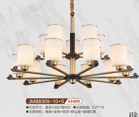 灯体尺寸:直径1060*高600 光源规划:E27*15 材质:哑黑+金色+铁艺+防尘罩+玻璃灯罩
