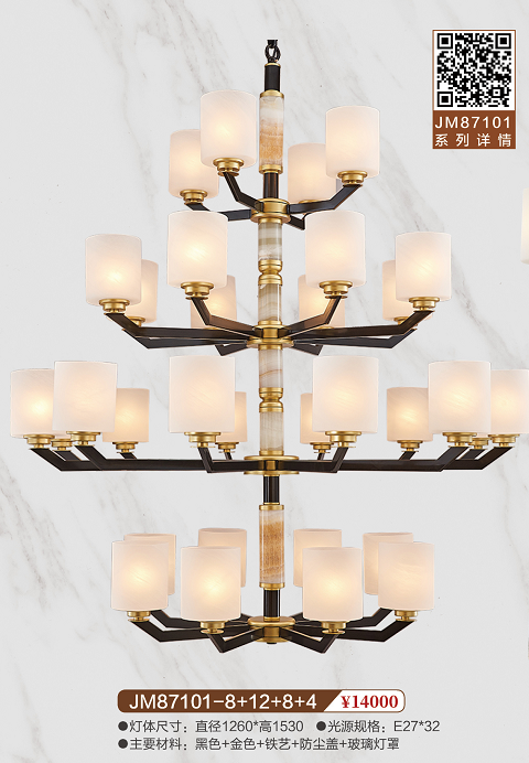 灯体尺寸:直径1260*高1530 光源规划:E27*32 材质:黑色+金色+铁艺+防尘罩+玻璃灯罩