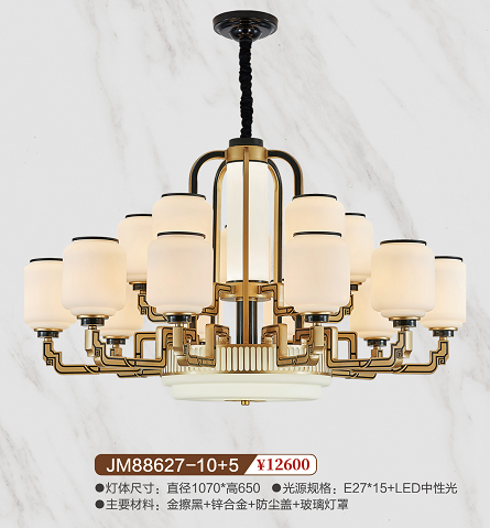 灯体尺寸:直径1070*高650 光源规划:E27*15+LED中性光 材质:金擦黑+锌合金+防尘罩+玻璃灯罩