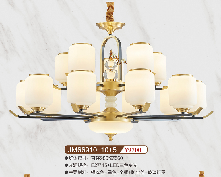 灯体尺寸:直径980*高560 光源规划:E27*15+LED三色变光 材质:铜本色+黑色+全铜+防尘盖+玻璃灯罩