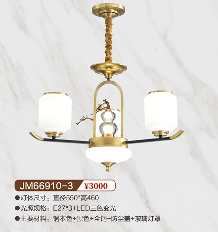 灯体尺寸:直径550*高460 光源规划:E27*3+LED三色变光 材质:铜本色+黑色+全铜+防尘盖+玻璃灯罩