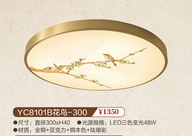 灯体尺寸:直径300*H40 光源规划:LED三色变光48W