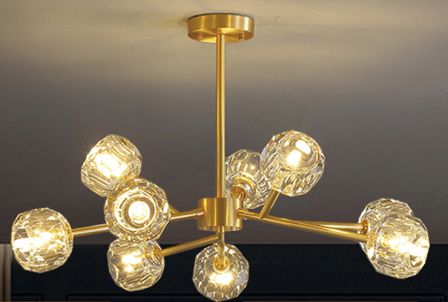 灯体尺寸:直径920*高450 光源规划:G9*12(小号) 材质:铜材+80MM半磨水晶球+金色