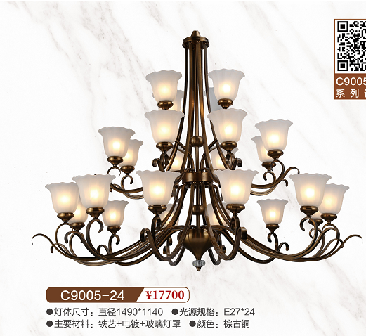 灯体尺寸:直径1490*1140 光源规划:E27*24 材质:铁艺+电镀+玻璃灯罩 颜色:棕古铜