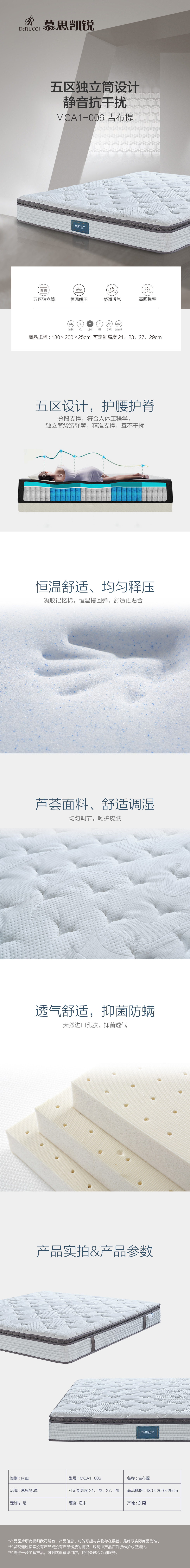 床垫表面采用了芦荟面料,芦荟纤维结构类似棉纤维,具有良好的吸湿性和放湿性,能根据床垫环境的湿度进行均 衡调节,保证睡眠的舒适性同时能持久调节睡眠环境的空气质量,呵护人体皮肤,让使用者睡得更踏实。恒温减压 :我们在床垫中采用了凝胶记忆棉,它可以吸收人体多余的热量让您躺在上面感受都十分清凉舒爽,能有效的缓解您 在睡眠过程中产生的燥热感,从而提高您的睡眠质量,像您刚刚躺了这么久是不是一直都很清凉很舒爽;同时记忆棉 具备慢回弹和记忆身体曲线的功能,可以分散身体的各接触部位的压力,使得床垫的贴合度更强,达到充分适合人体 睡眠的作用。二者相结合既能保证身体舒适的睡眠温度,又贴合身体缓解压力。独特五区设计:支撑层采用了五区独立筒,分段式独立支撑,能够让您在睡眠中无论是肩、背、腰、臀、腿都能得到非常好的支 撑,让您的身体该支撑的地方得到支撑,该下陷的地方得到合理下陷,让脊椎保持自然平直姿态,同时还有很强的互 不干扰能力,当夫妻一起睡在这张床垫上,不用担心会影响另一半的睡眠。静音效果好,让我们身体充分放松,缓解 身体压力,减少翻身次数,保证睡眠质量。透气舒爽:背面采用3D网状透气面料,中空立体结构形成空气微循环,极大提高了床垫的透气性,保证床垫可以及时的排湿 保证床垫内部干爽,不易滋生螨虫细菌,有效防止皮肤骚痒,更好的呵护您和家人的肌肤。