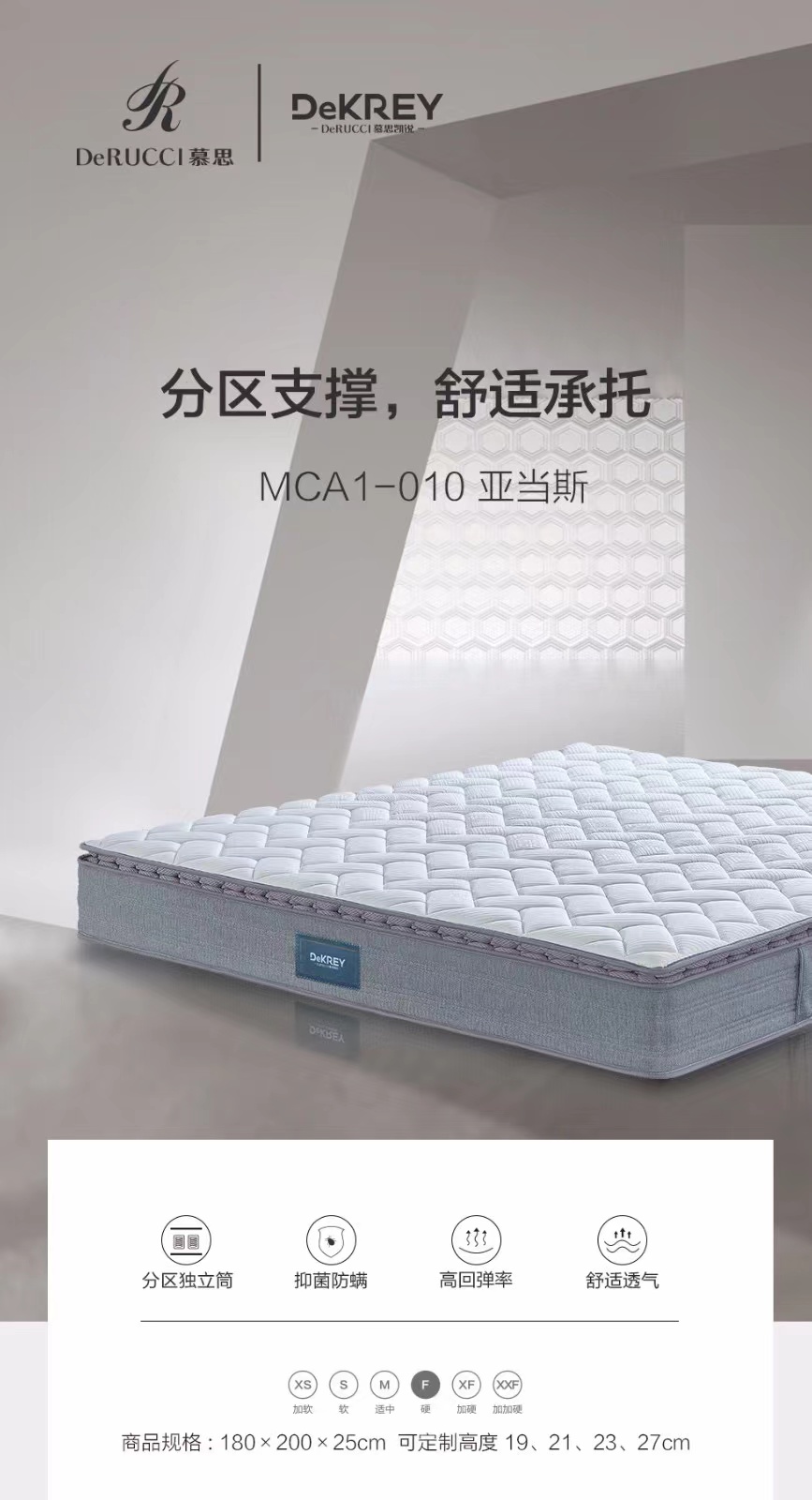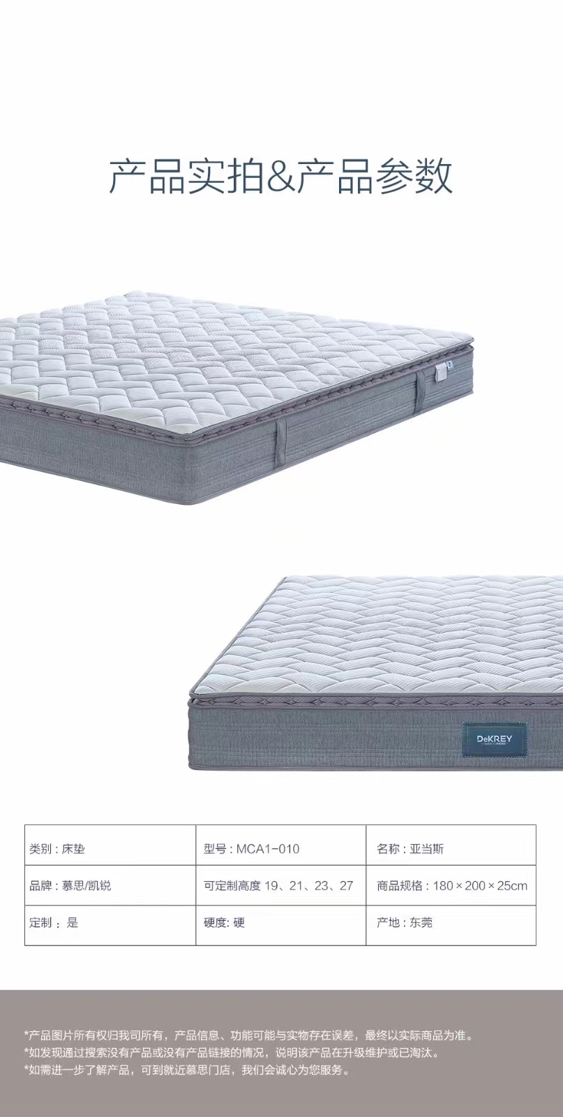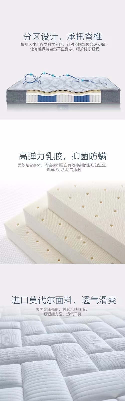 床垫表面采用了进口莫代尔面料表面光泽亮丽,韧性强不易断裂,手感特别亲肤特别滑爽,同时其吸湿能力比棉高 出50%,这使其可保持干爽、透气,可令您的肌肤经常保持干爽舒适的感觉,有利于人体的生理循环和健康。五区设计:支撑层采用了五区独立筒,分段式独立支撑,能够让您在睡眠中无论是肩、背、腰、臀、腿都能得到非常好的支 撑,让您的身体该支撑的地方得到支撑,该下陷的地方得到合理下陷,让脊椎保持自然平直姿态,同时还有很强的互 不干扰能力,当夫妻一起睡在这张床垫上,不用担心会影响另一半的睡眠。静音效果好,让我们身体充分放松,缓解 身体压力,减少翻身次数,保证睡眠质量。防菌抑螨:床垫的舒适层里面用到的是比利时阿迪兰特工艺制作的乳胶,其最大的特点就在于独特的真空发泡工艺,乳胶在发 泡过程中会行成很多天然的蜂窝状小孔,透气性非常好,有利于内部保持干爽透气,且乳胶的成分当中有含橡树蛋白, 可以有效抑制细菌和防止螨虫滋生,防止皮肤过敏影响我们的身体健康。透气舒爽:背面采用3D网状透气面料,中空立体结构形成空气微循环,极大提高了床垫的透气性,保证床垫可以及时的排湿 保证床垫内部干爽,不易滋生螨虫细菌,有效防止皮肤骚痒,更好的呵护您和家人的肌肤。
