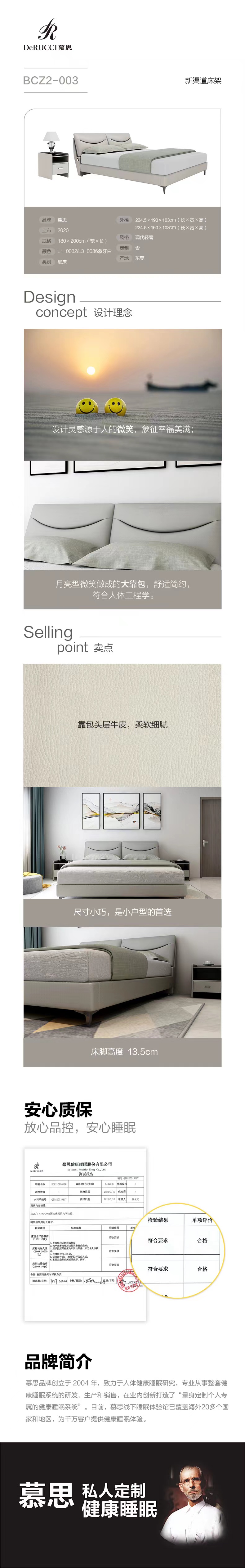 微笑月牙 你可以看下,这款床架的外观设计灵感源于人的微笑,象征幸福美满;月亮型微笑做成的大靠包,舒适简约。也象征着我们的生活甜甜蜜蜜,开开心心的,非常适合新婚夫妻。 齐边设计 床架外观采用三面齐边的床架设计,整体尺寸更小巧,有效节省卧室位置,不占空间,更适合小户型设计。像现在很多家庭的小户型房间都非常适合与百搭。 易于清洁 另外整体床身尺寸小巧而配合,配以黑色五金高脚,方便床下清洁,同时使其显得高挑又时尚。而且使用慕思经过严格的清洁测试,日常清洗打理不止简单,而且耐用。