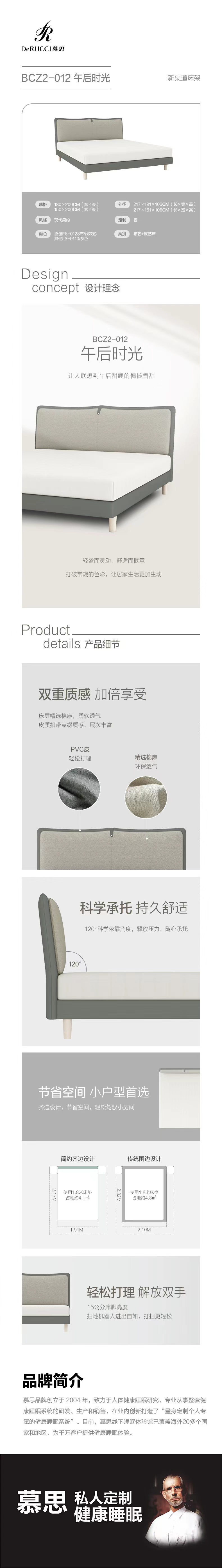 皮布结合 你可以过来感受下,接触的主要材质采用非常舒适亲肤的皮艺材质,不止触感舒适,而且久靠不累,伴着安全感入睡;并且采用的双色设计,更有立体感,深色系的配色,提升床架整体时尚感,使床架更百搭时尚。 齐边设计 床架外观采用三面齐边的床架设计,整体尺寸更小巧,有效节省卧室位置,不占空间,更适合小户型设计。 易于打理 靠包区域使用的类棉麻亲肤面料,靠感舒适,亲肤耐磨,使得我们在依靠时更舒适。而且搭配高床脚设计,也便于机器人进出打扫。