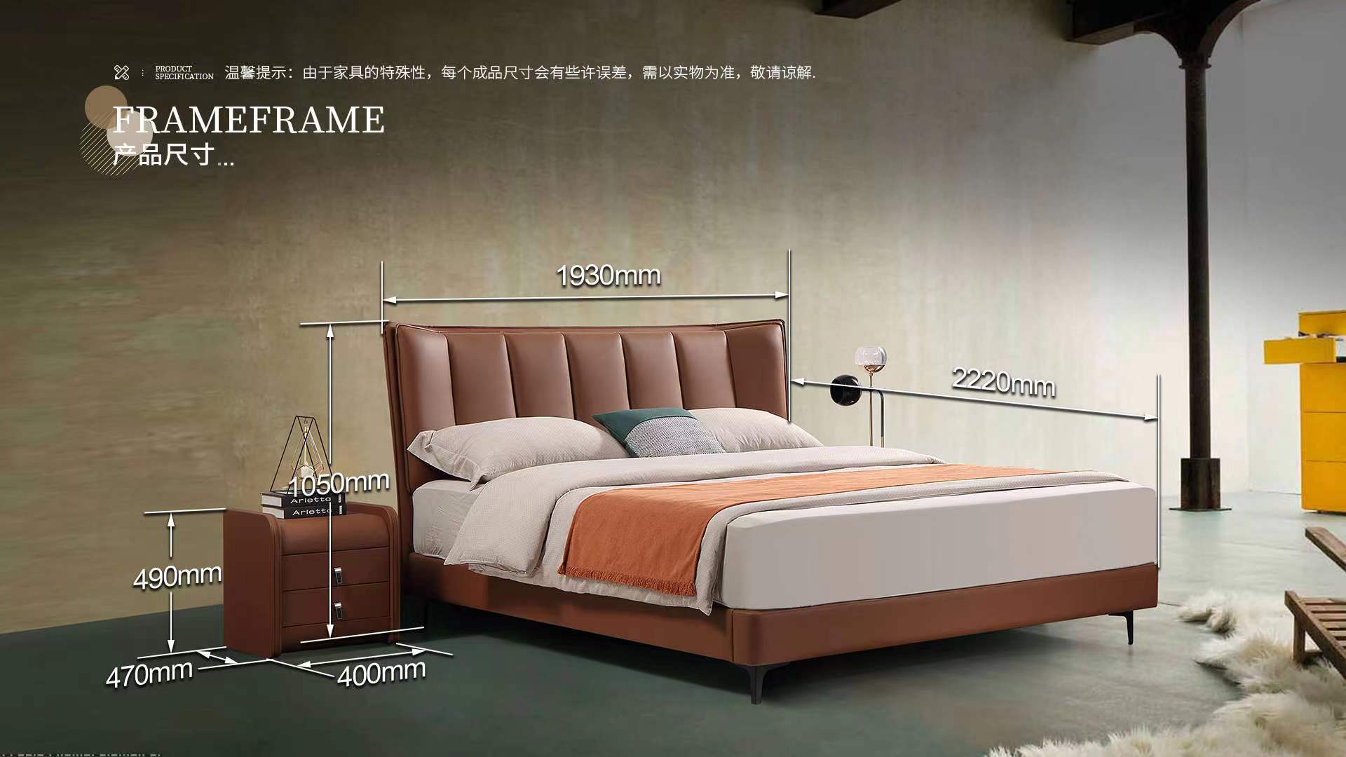 材质/头层真皮 颜色/深咖 规格/ 1.8米床内框尺寸:长2000* 宽1800mm 外框尺寸:长2220*宽1930高1050mm 床头柜尺寸:宽400深470*高490mm 特点/ 1.采用竖条靠包设计,整体流线舒适协调,深咖色的搭配沉稳且优雅。 2.使用进口落叶松钢木排骨架,承受重量高达700公斤以上。 3.使用实木抽床头柜,也可改色,详情请咨询厂家。 、